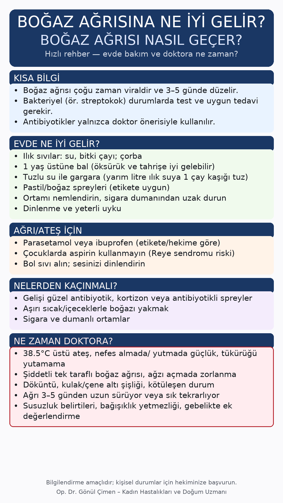 Sonuç: Boğaz ağrısı yaşıyorsanız, hele ki son yıllarda, aklınıza COVID-19 da gelmelidir. Özellikle yaygın enfeksiyonların olduğu dönemlerde bu belirtileri olan kişilerin maske takması, kalabalıklardan uzak durması, mümkünse test yapması toplum sağlığı açısından faydalıdır. Ancak paniğe gerek yok; boğaz ağrısıyla seyreden COVID vakalarının çoğu, aşılar sayesinde de, hafif atlatılıyor. Yine de risk grupları (yaşlılar, kronik hastalar, hamileler vs.) korunmalıdır. Boğaz ağrınız COVID çıkarsa da, bol sıvı alıp dinlenin, gerektiğinde ateş düşürücü alın ve doktorunuz başka bir özel tedavi (antiviral ilaç gibi) önermediyse, izolasyon süresince evde istirahatle genellikle iyileşeceksiniz.